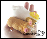 Each critter can be squeezed and stretched! This soft pet is 4.5" long x 2" tall and 1.5" thick when unstretched. (it can easily stretch up to 15"). These soft toys can be stretched far because they are thick. (within moderation of course).