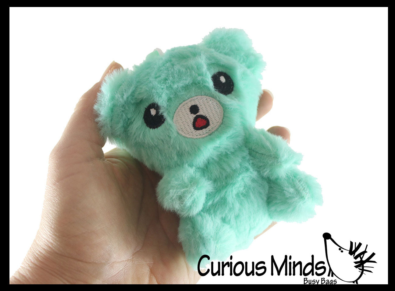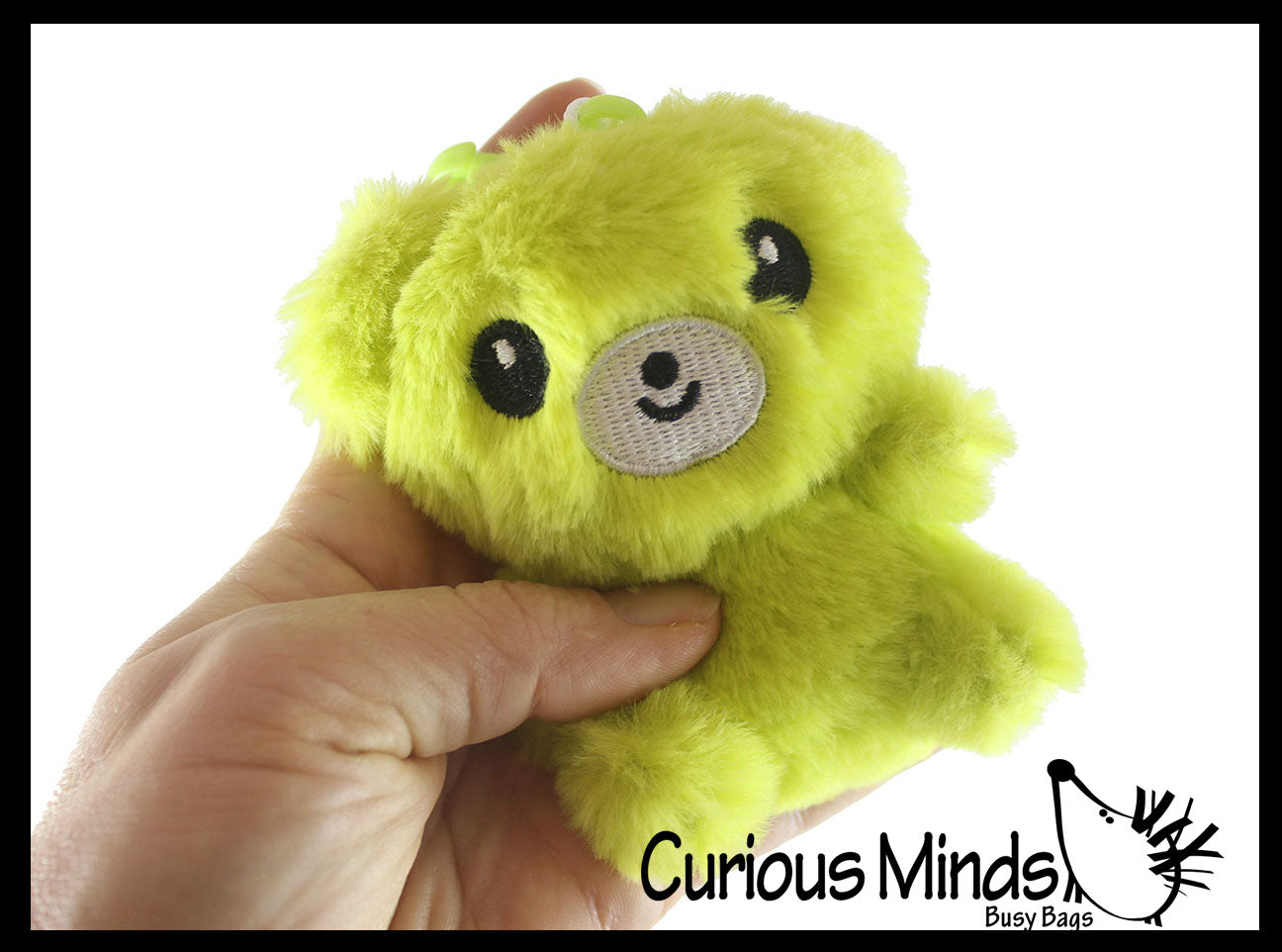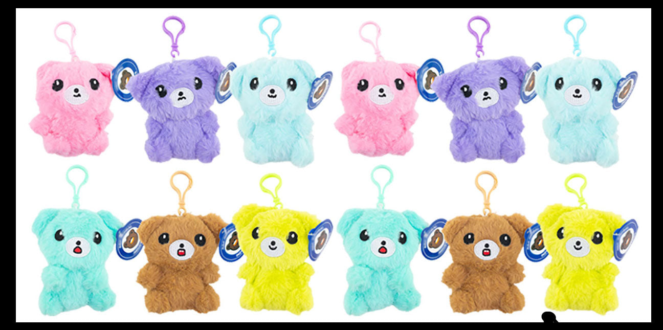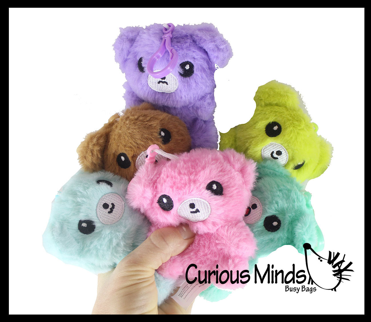 These adorable bears are small plush animals that have a clip on them so you can attach them to bags, backpacks, purses, lanyards, or keys. Each soft and fuzzy bear is 4" tall x 4" wide, and come in 6 colors. Each playful bear has a different sewn on expression on their faces. They are perfect party favor gifts or prizes for rewards or carnivals.