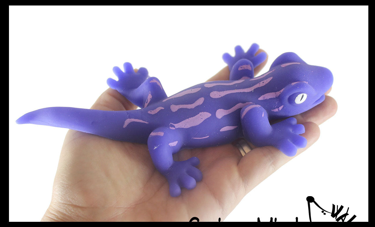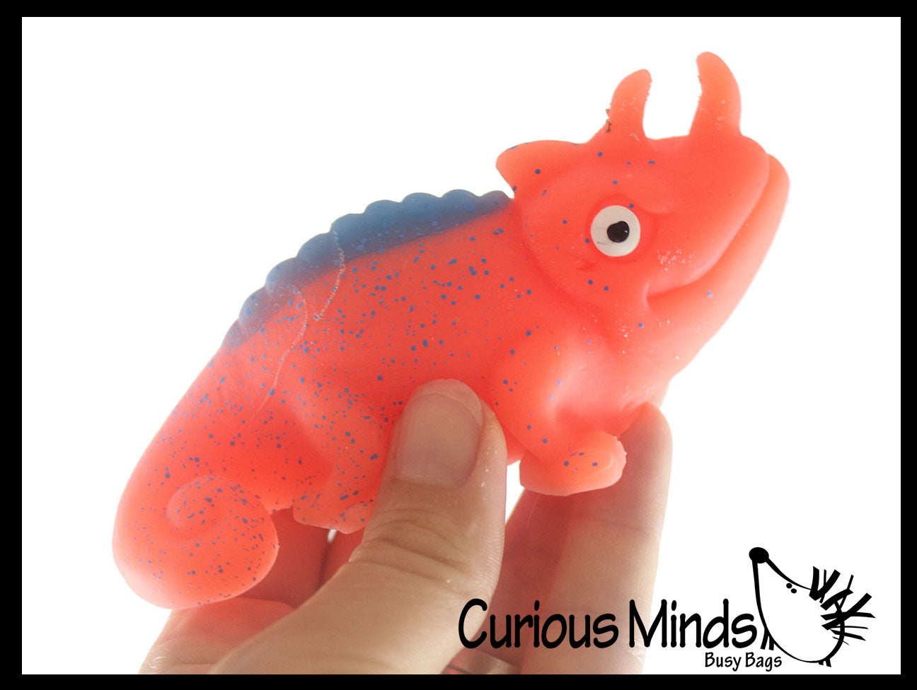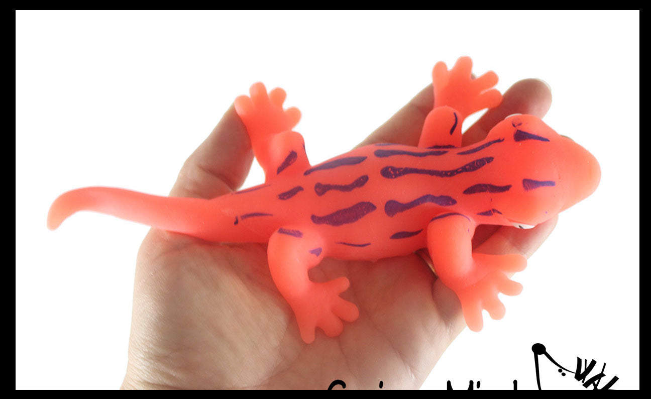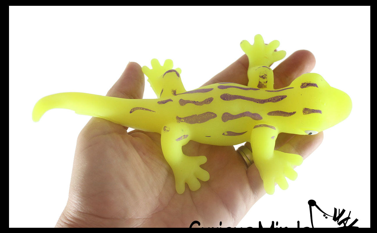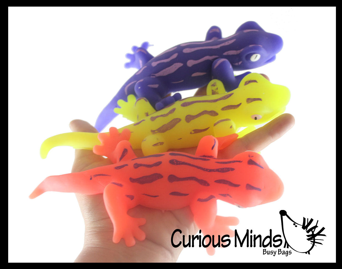 These colorful amphibians are very soft, thick squishy jelly like toys.  They are very flexible and floppy making them a favorite amongst children.  These are not sticky and VERY scented.  They have a strong sweet smell to them adding to the sensory experience.  The animals are stretchy and flexible, meaning the paint details will not be permeant since paint doesn't stay on items that are this stretchy.  Comes in 4 animal styles (chameleon, horn lizard, lizard, and a thicker tailed lizard), and 4 bright colors.