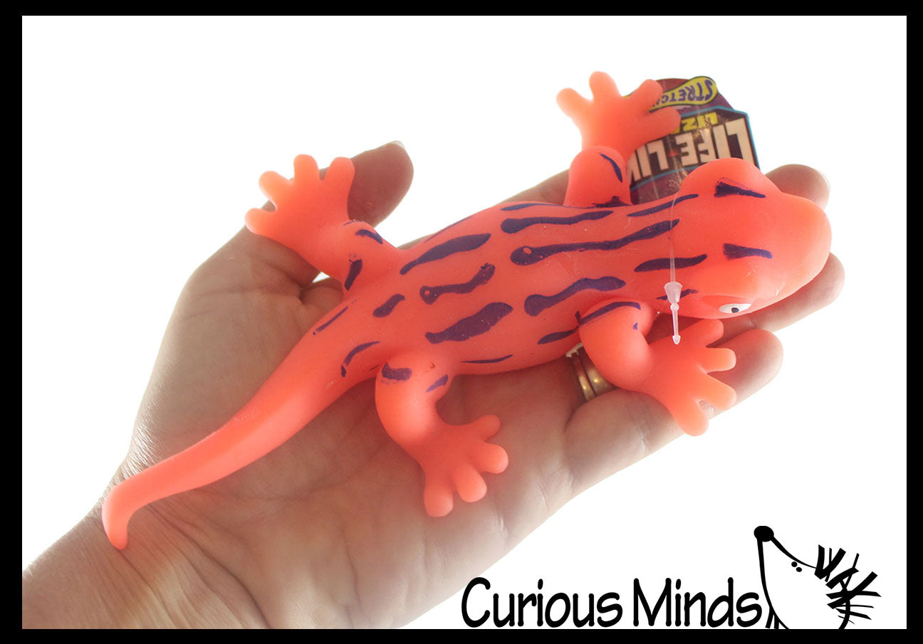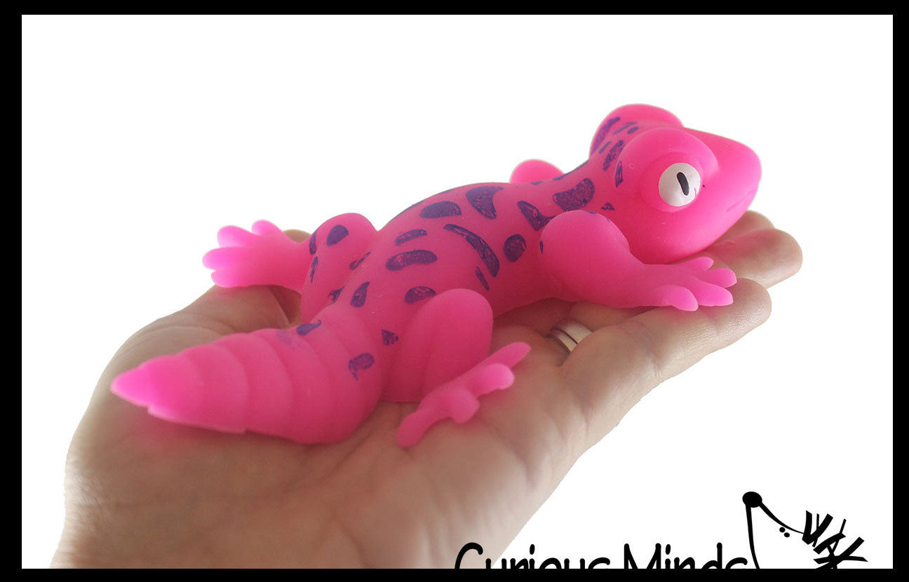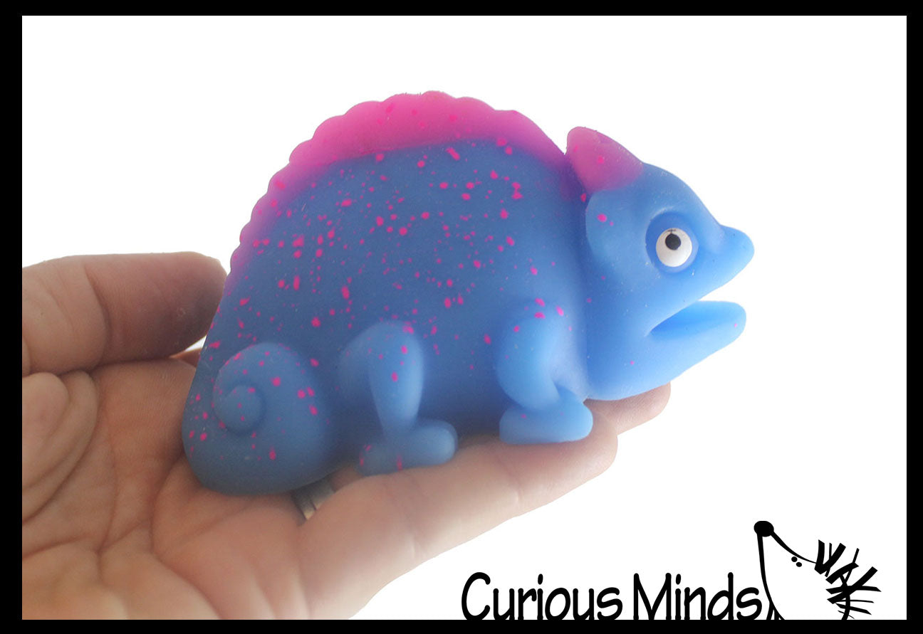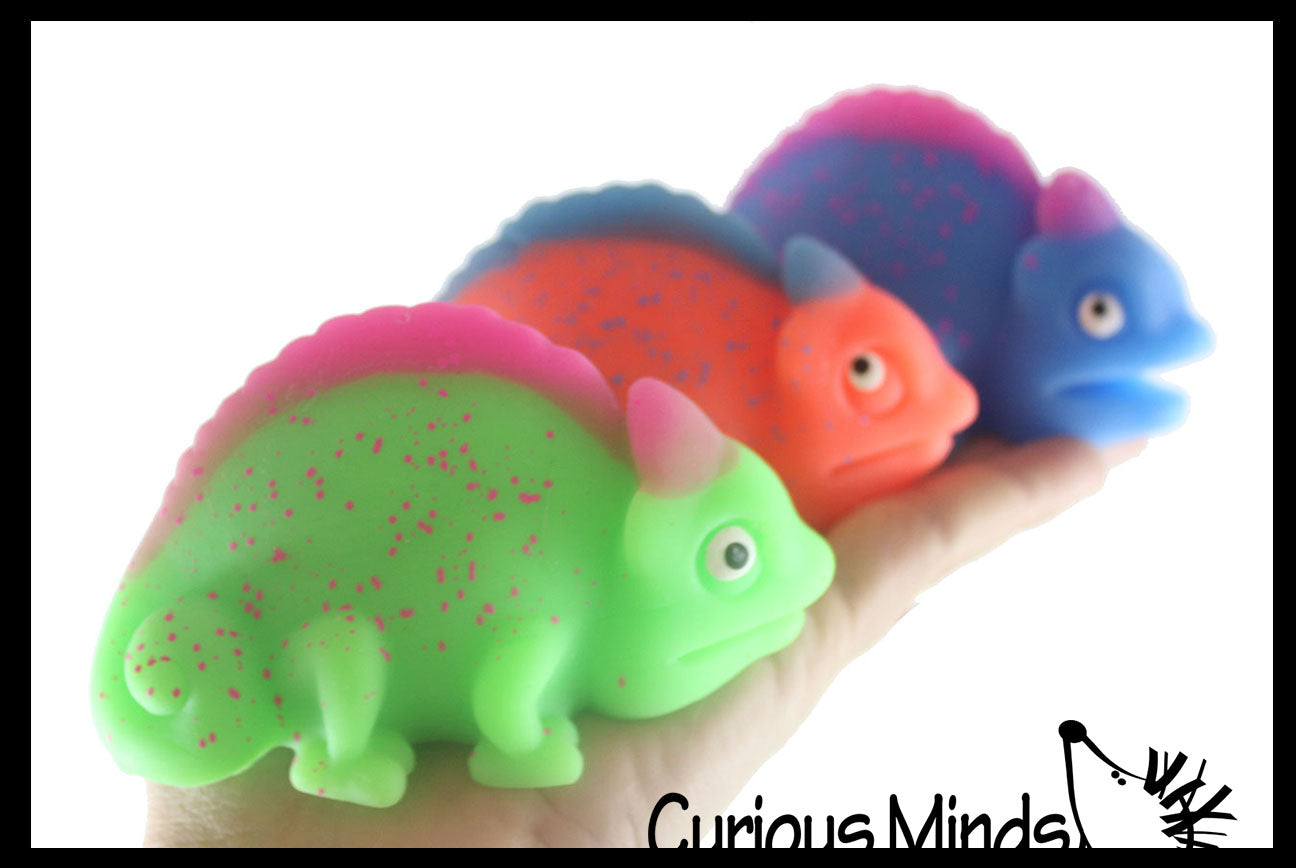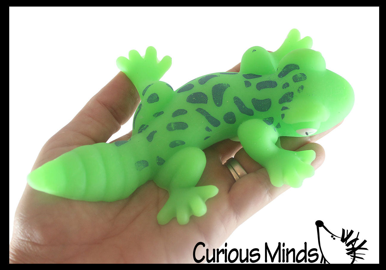 These colorful amphibians are very soft, thick squishy jelly like toys.  They are very flexible and floppy making them a favorite amongst children.  These are not sticky and VERY scented.  They have a strong sweet smell to them adding to the sensory experience.  The animals are stretchy and flexible, meaning the paint details will not be permeant since paint doesn't stay on items that are this stretchy.  Comes in 4 animal styles (chameleon, horn lizard, lizard, and a thicker tailed lizard), and 4 bright colors.