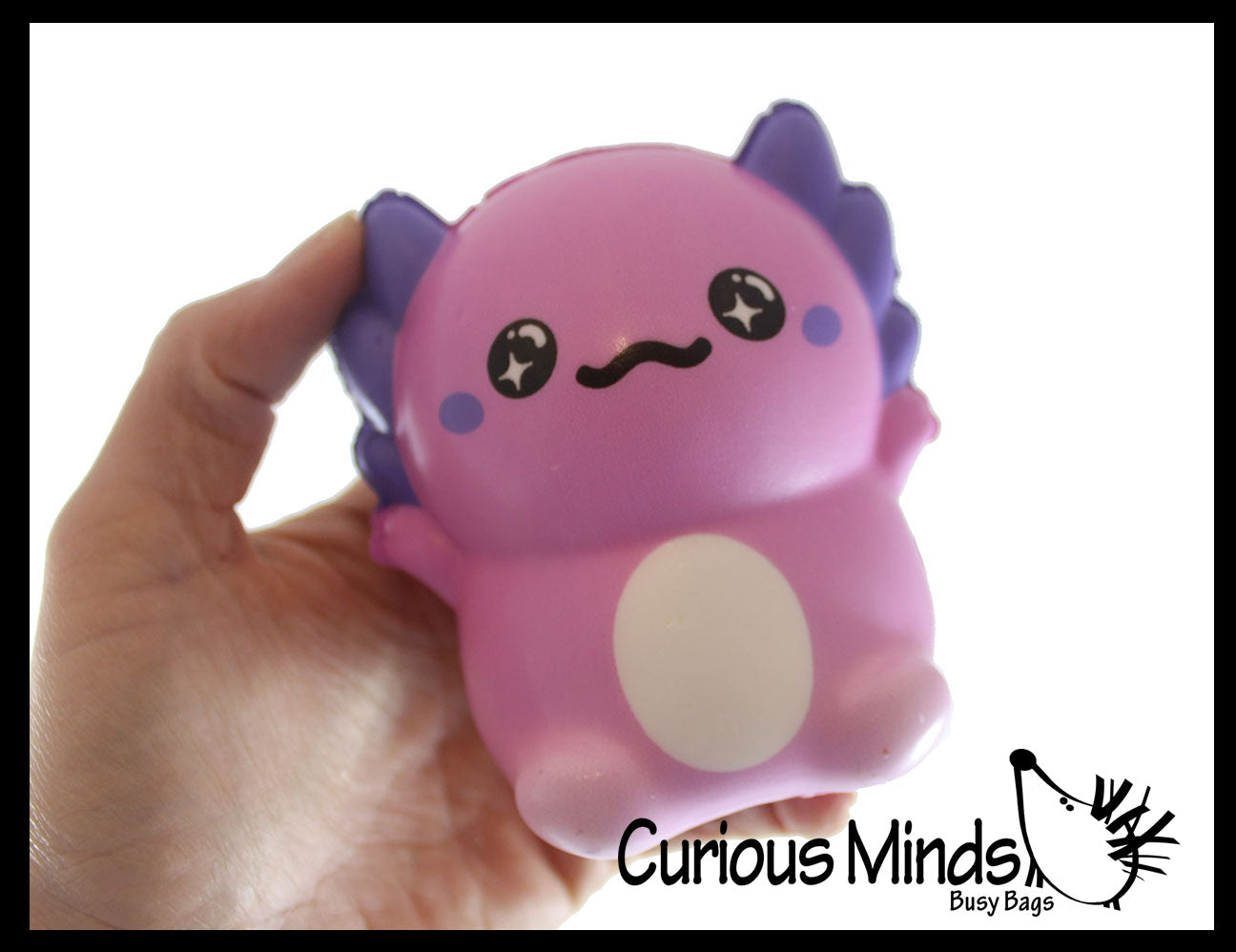 These adorable axolotl themed toys are made from the cool memory foam slow rise squishy material.  They are super soft and squishes easily then slowly comes back to its shape.  The squishy toys make perfect party favors or prizes  Since it is a squeezy toy it makes a fun stress ball and helps build hand strength!  Each squishy is individually wrapped. Assortment of 10 different axolotls. They are 4" x 3" X 2.5".