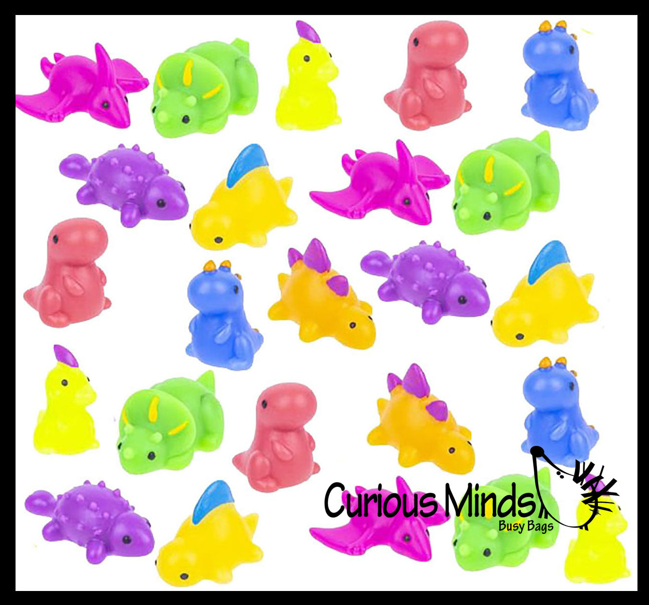 These adorable jiggly critters are tiny little squishy dinosaurs. They have a unique, almost gummy feel. The animals are soft yet almost sticky and make a nice small finger fidget. They are tacky enough to place on a desk to discretely poke with fingers and would make nice finger warm up tools. These little guys do pick up lint because of the tacky surface. You can wash then coat with some cornstarch to bring them back. Each animal is individually wrapped making them ideal for party favors or prize boxes. Ages 3+. Dinosaurs average 2.5" long x 1.25".