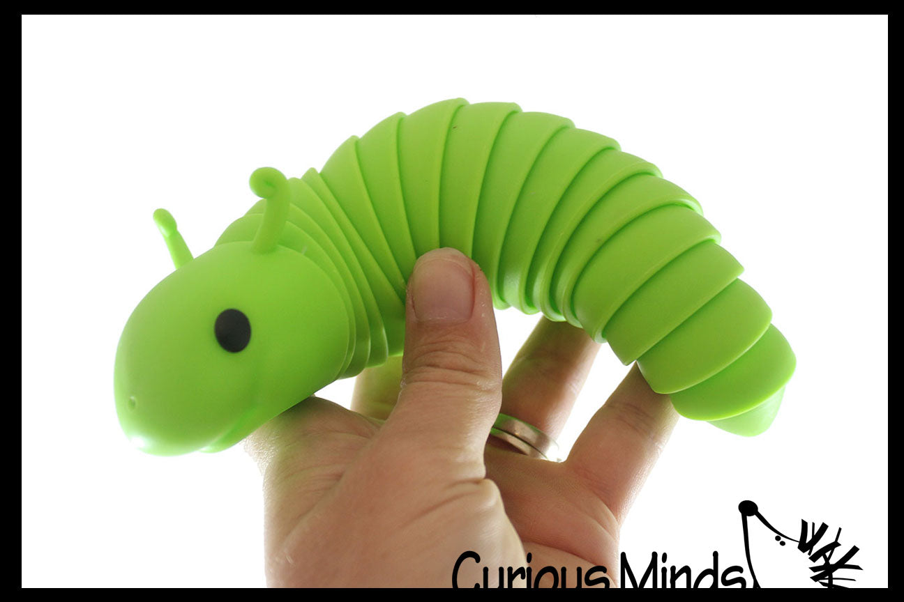 This caterpillar is a super cool fidget!  The bug is quite large measuring in at 7" long and 2" wide.  The caterpillar is made up of several hard plastic bowls that are connected.  This gives the slug a jointed and robotic movement.  You can twist and spin the slug in your hand.  The hard plastic makes a nice sooting sound as the colored cups rub together and move.  It is quite mesmerizing to feel.  Great sensory toy.  Comes in 2 colors: rainbow and green.