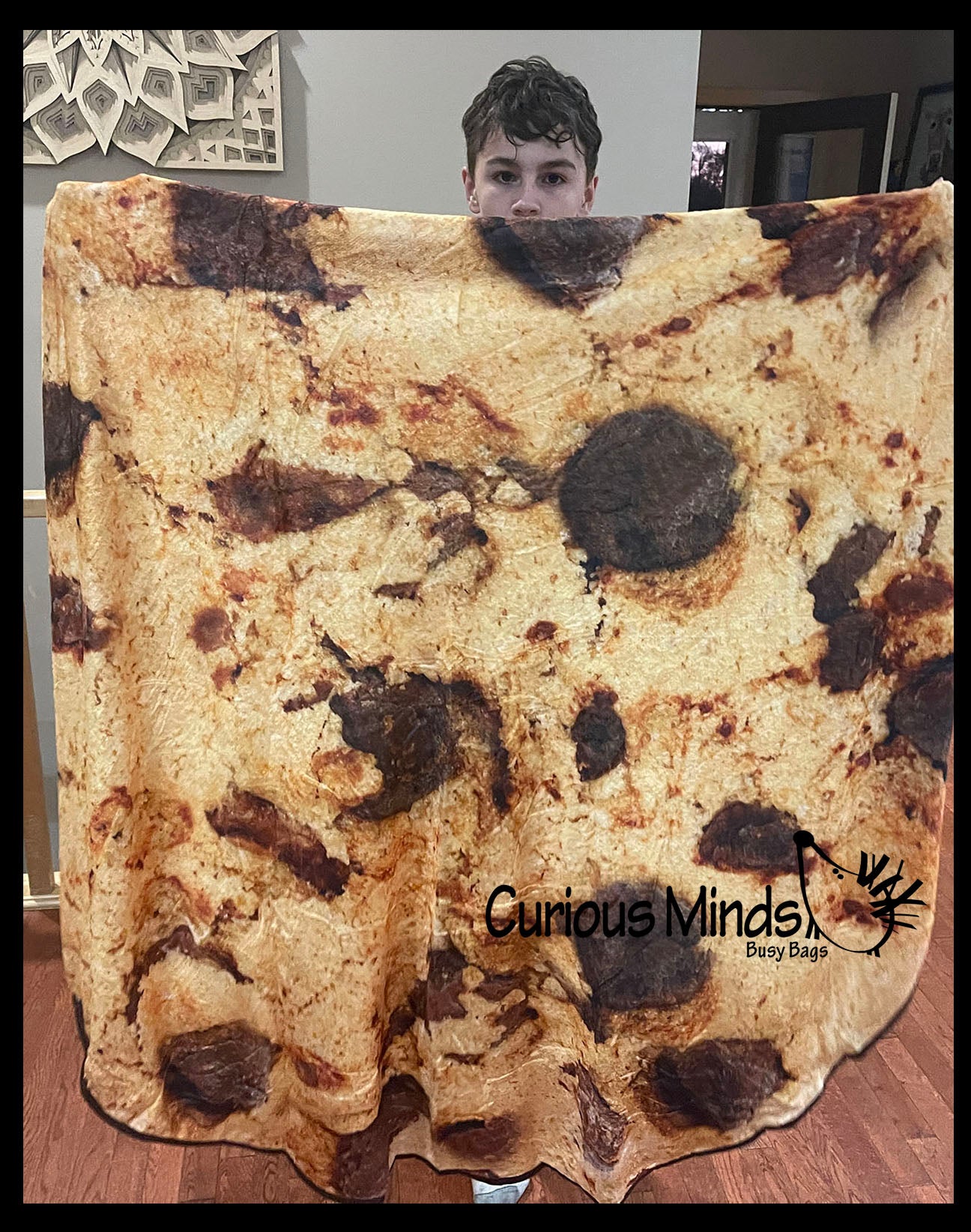 This round blanket is a fun food themed throw blanket.  The blanket has a chocolate chip cookie printed on one side, and a soft white fluff on the other side.  This lightweight blanket is 5 foot in diameter (60") and is the perfect size for a throw blanket on the sofa or chair, or for kids to wrap themselves up in.  They look cute in any room including the living room and bedrooms.  These cute novelty blankets make great cozy gifts for kids and adults of all ages.