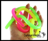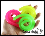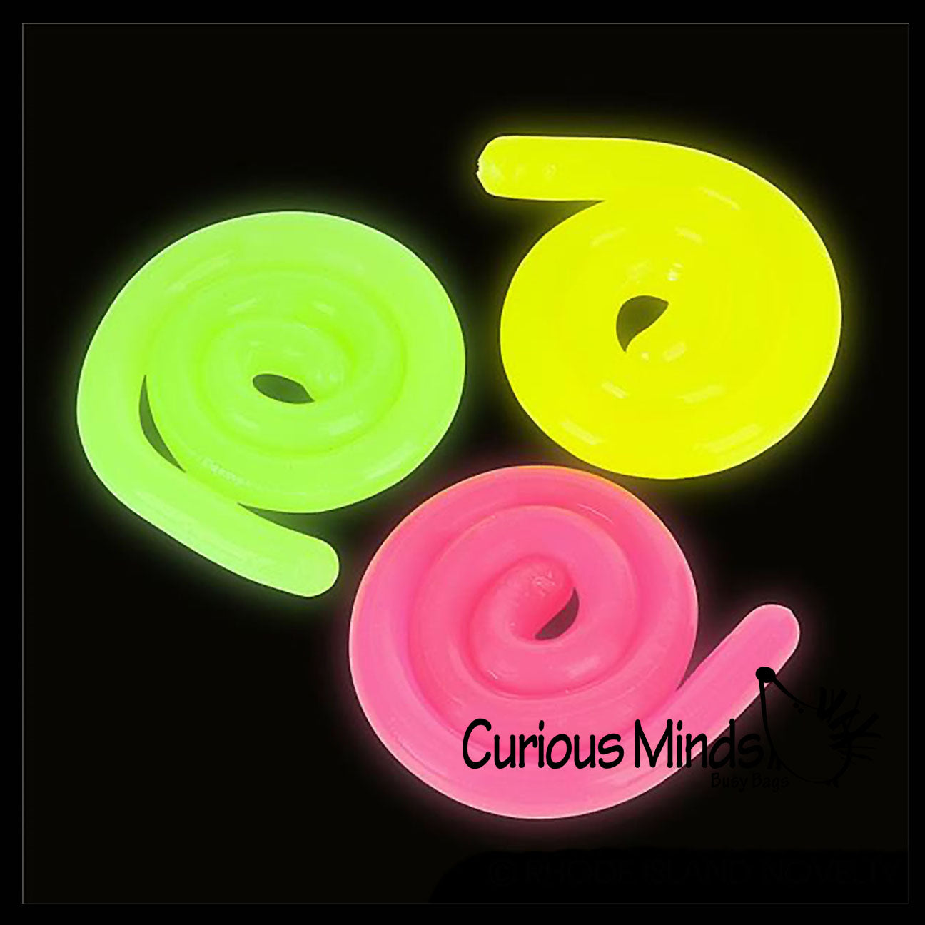 Stretchy String - a super long coiled string that can be stretched out forever (almost) Great for hand strength and bilateral coordination. This stretchy string is approximately 14" long, and can stretch out way further. It is simply a fun fidget to pull and twist while you are trying to focus. These stretchy noodles glow in the dark after they are activated by light! Comes in 3 bright neon colors.
