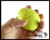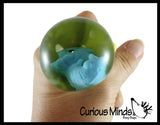 This soothing sensory ball is filled with a clear liquid with a baby dinosaur figure floating in it. The outside of the ball is a flexible textured colored eggshell with a crack in it. When you squeeze the ball, the baby dinosaur pops out of its egg! This is a fun sensory ball and it also makes a soft swishing sound to add to the sensory experience. Egg - 2.5" x 2". Comes in 4 colors with a random dinosaur inside.