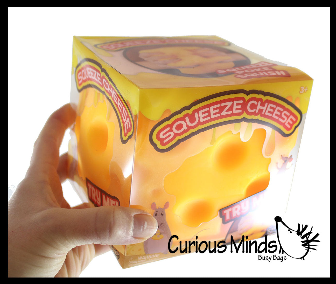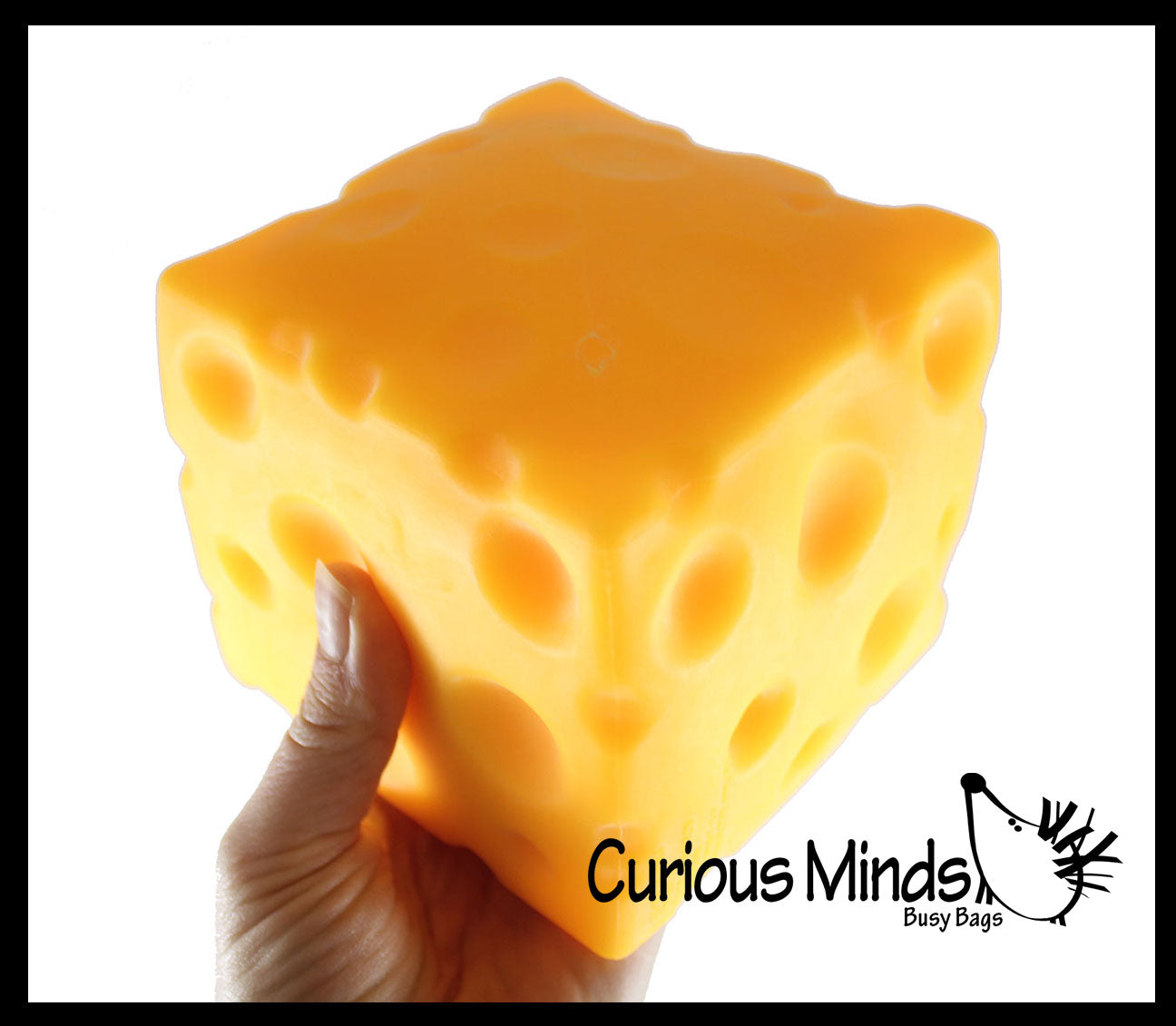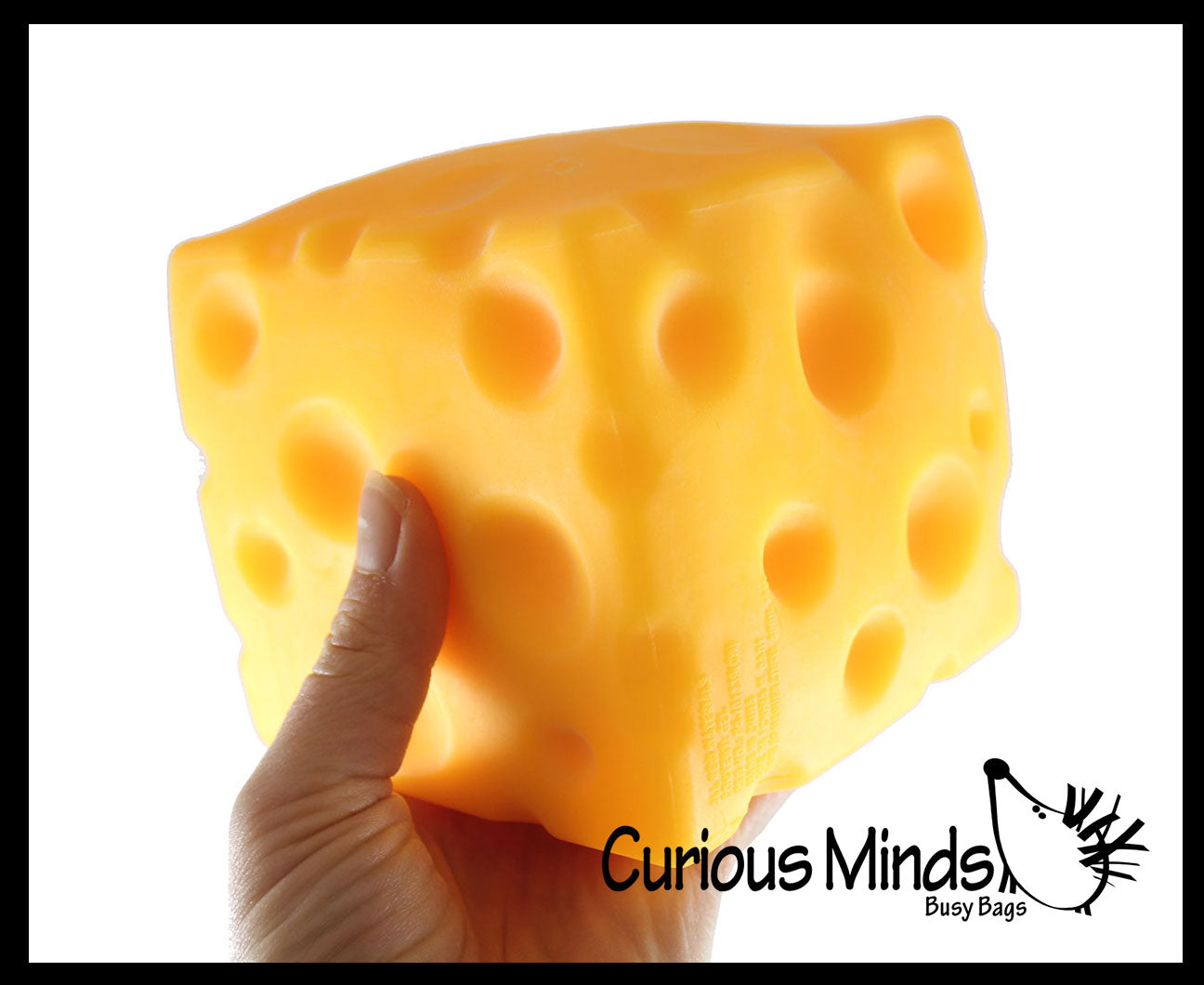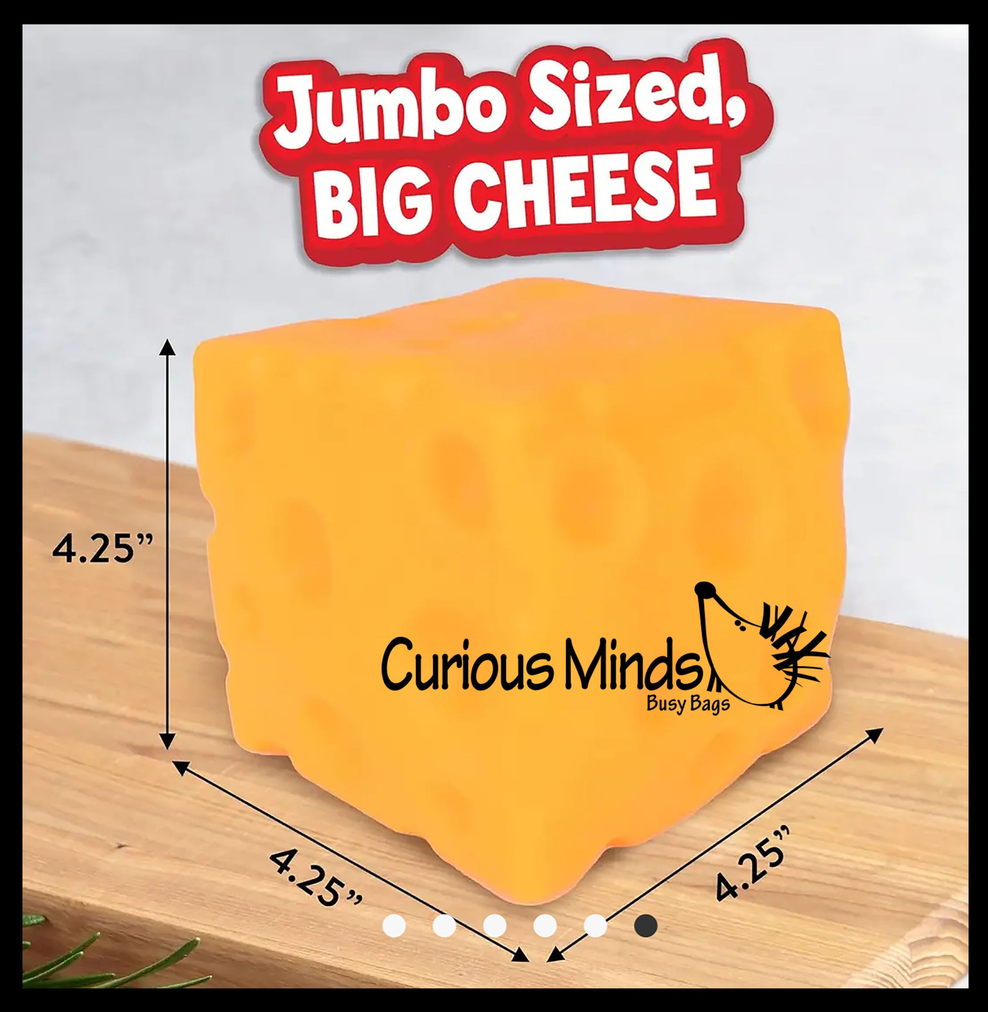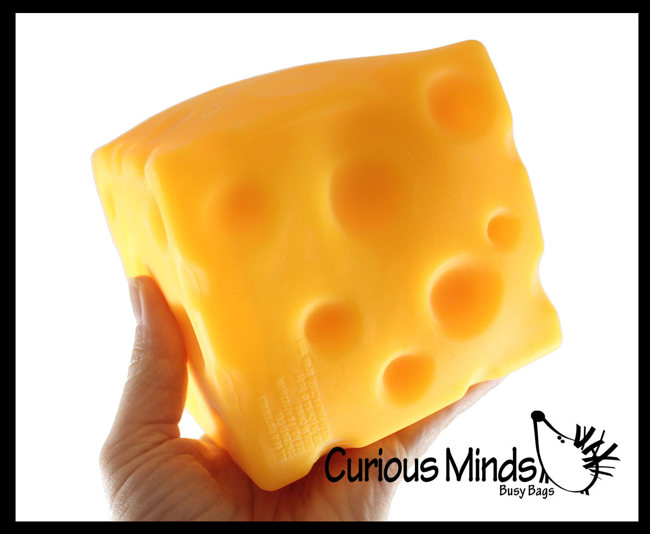 This cheese cube is huge! It is 4.75" x 4.75" x 4.75". These chunks of cheese are amazing because they are filled with a thick doh. It is a jumbo ball that is filled with a stretchy taffy like doh which makes it a large moldable stress ball.