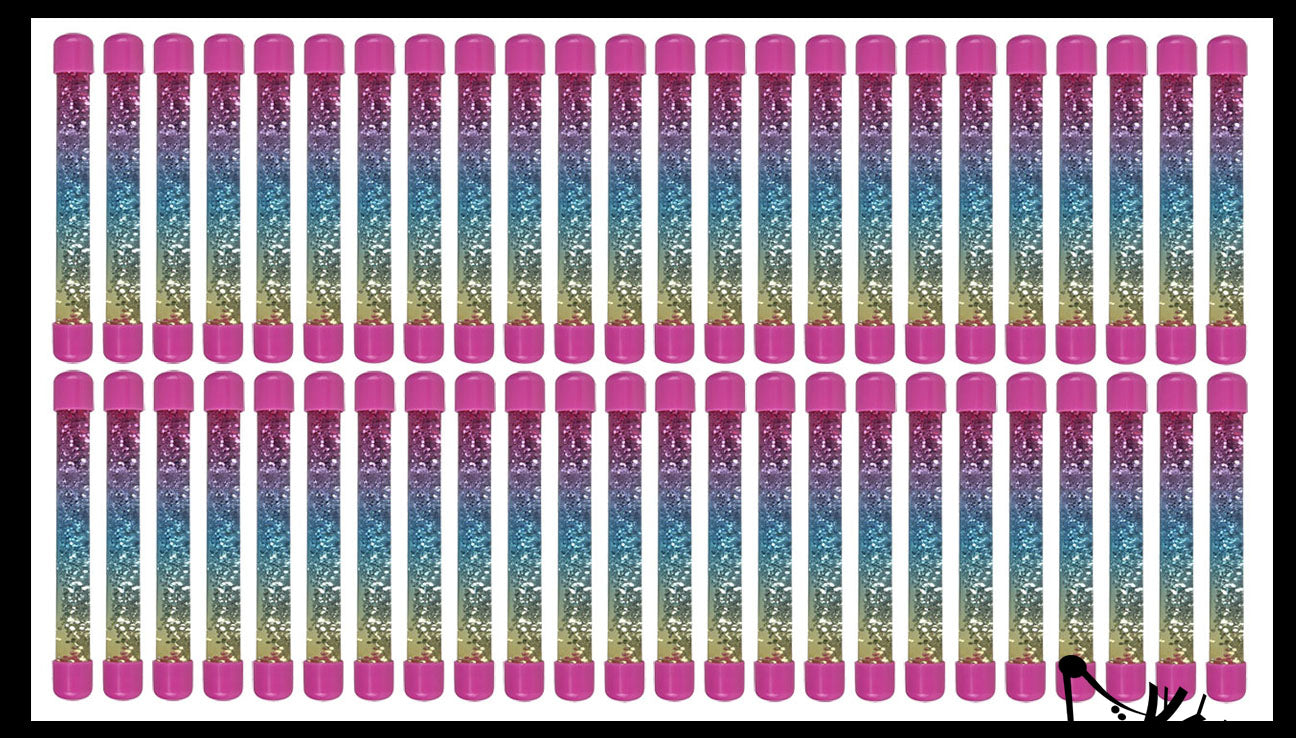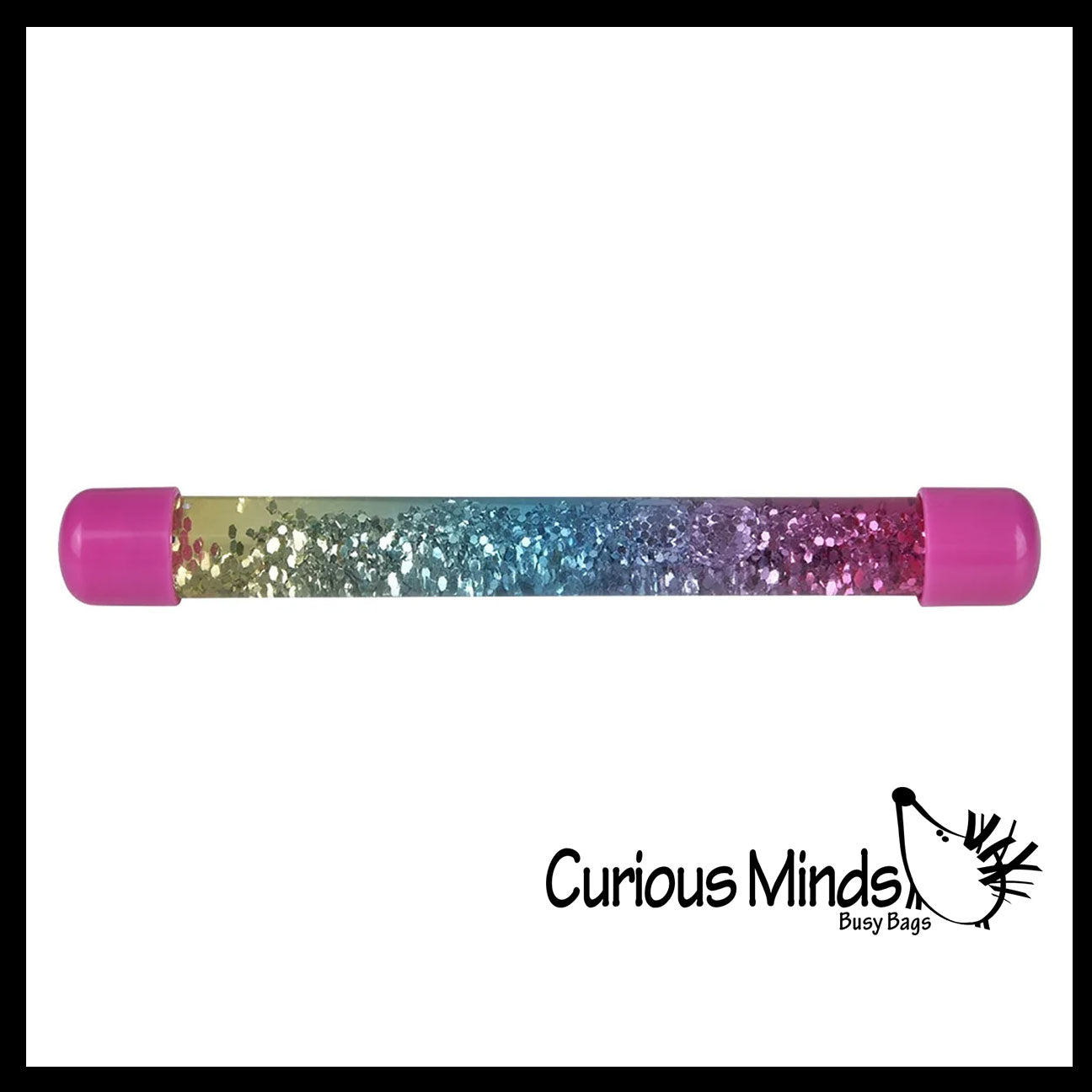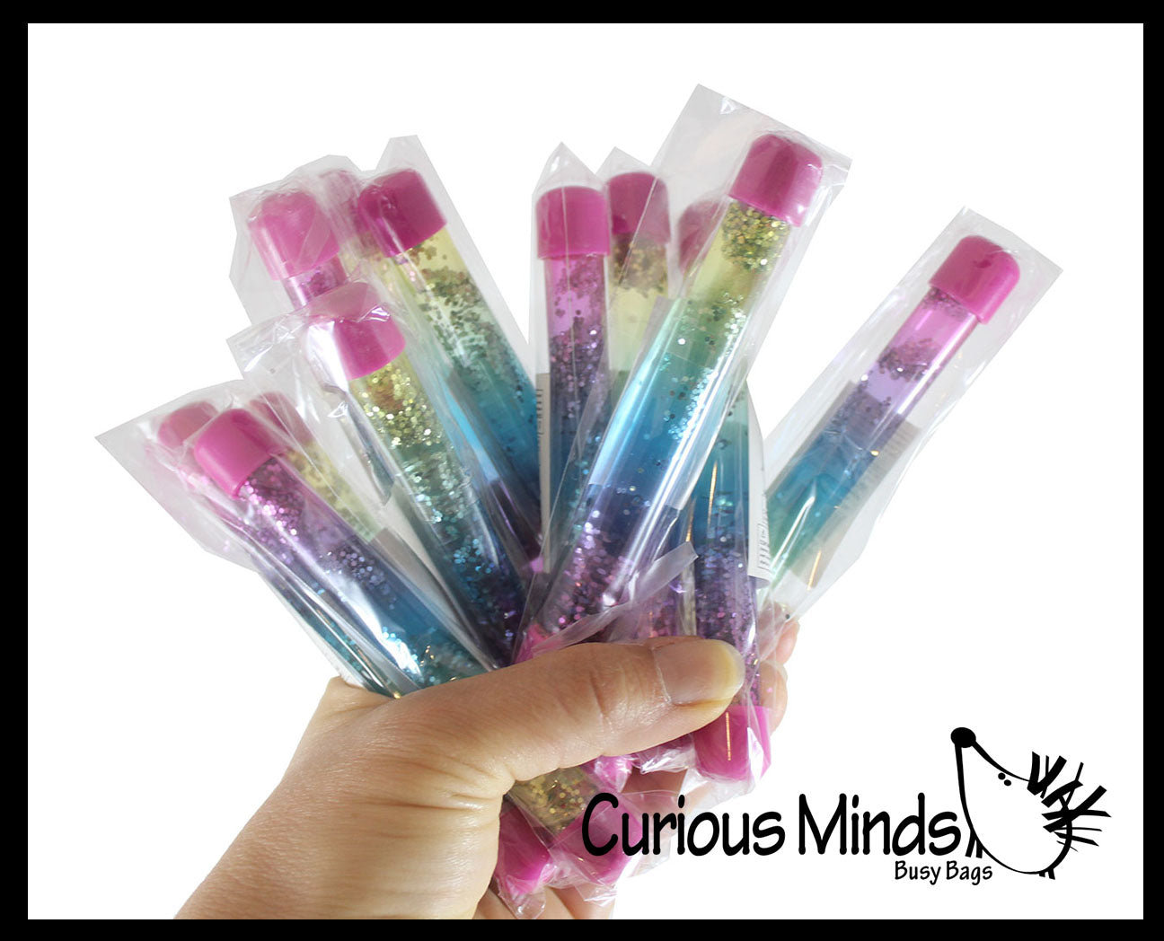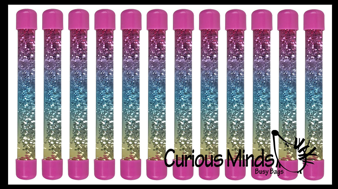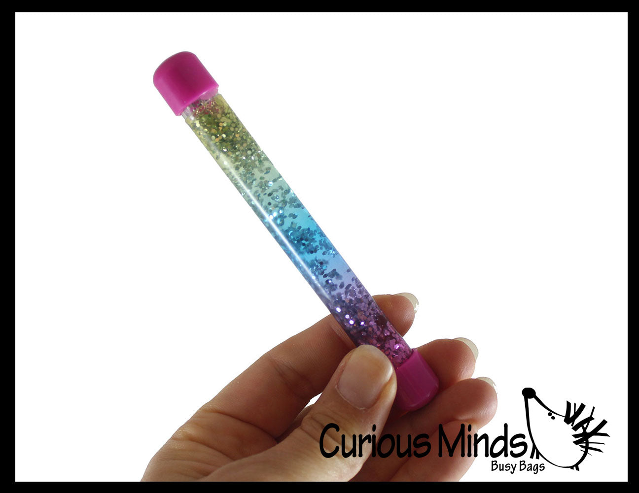 These water glitter tube batons are fun for pretend play, dance, and as a fidget. The mini 5" wand is filled with water with glitter inside. When you tip and twirl the stick the glitter inside slowly moves to the bottom. You can tip the tube to make the colored glitter slowly move, and watch as it falls and spirals to the bottom. Tip it again to put it back in motion. This toy is fun to be played with making it a discreet fidget for the school or office. This is a fun calm down visual fidget.