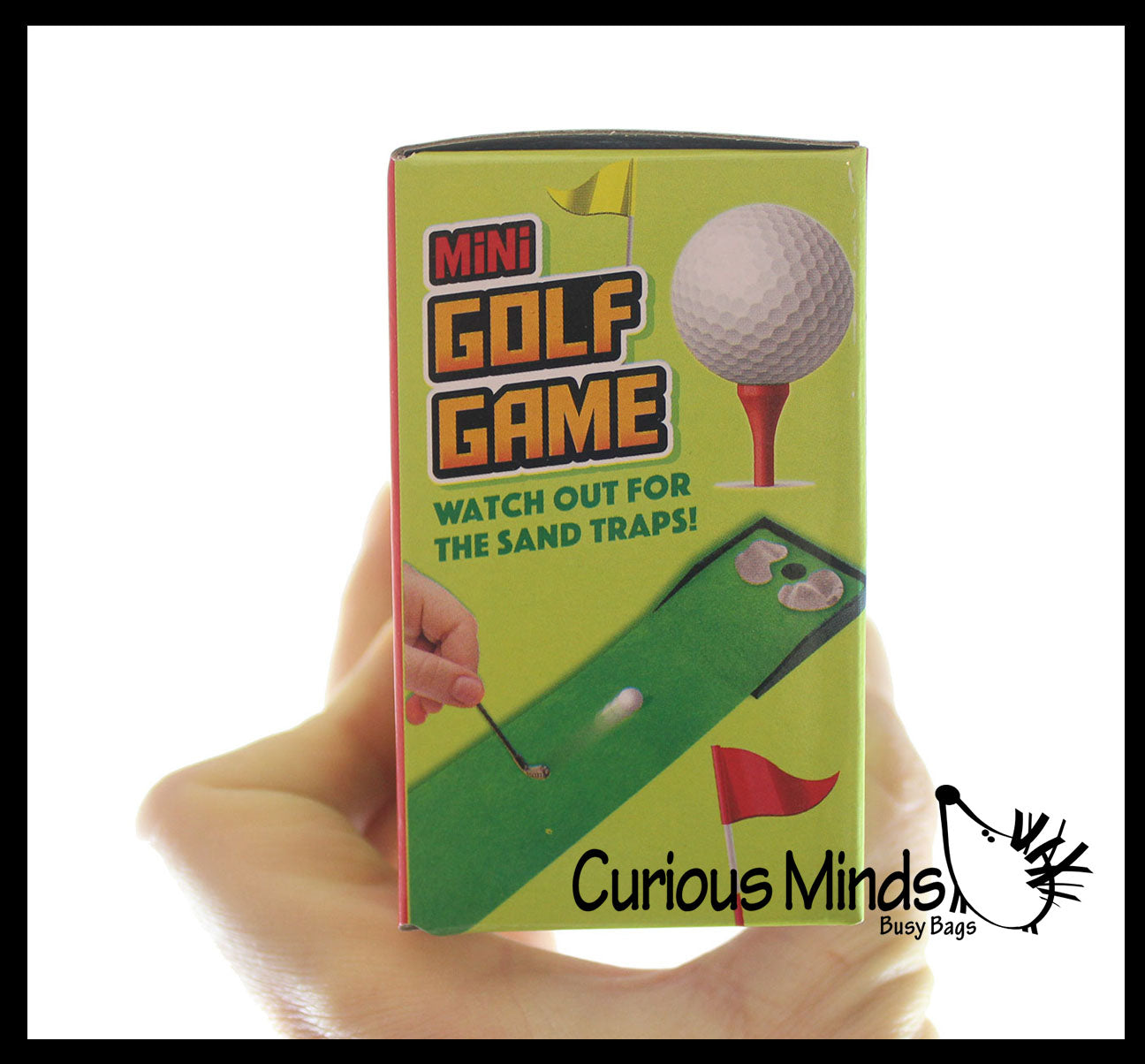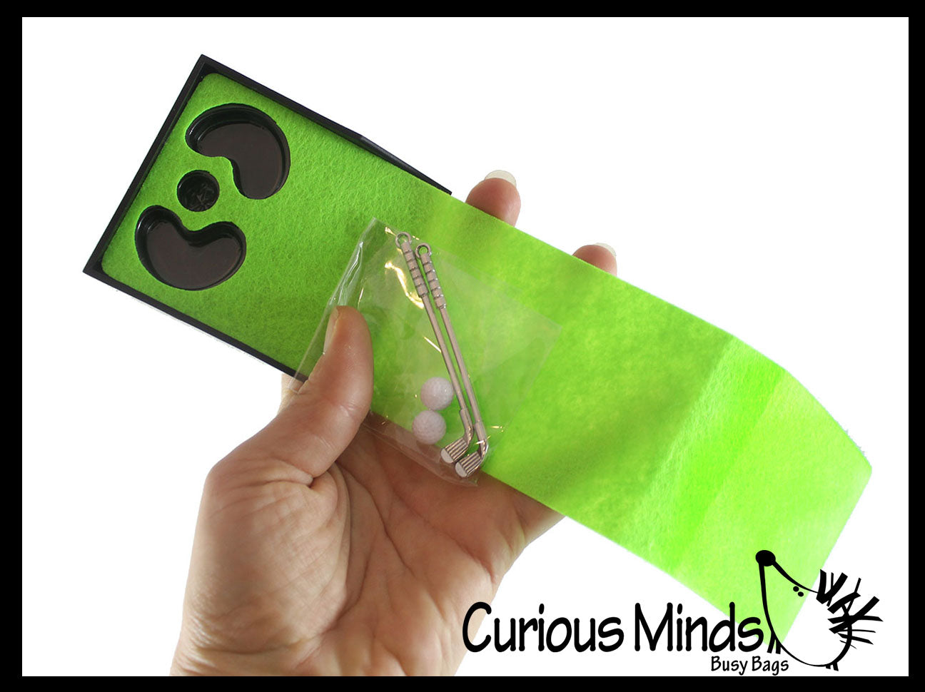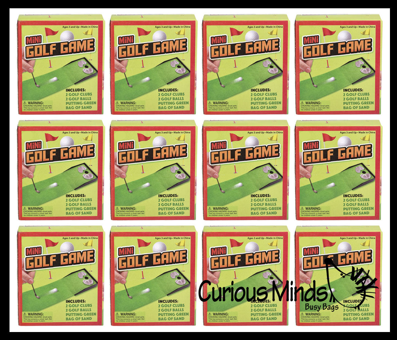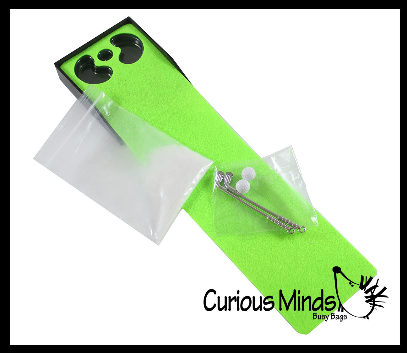 This golf practice set is so cute and is a perfect desk top game for home and office. The tiny set is a miniature version of the real thing that comes with a golf putting green (10.5" x 2.75"), 2 putter clubs (2.75"), and 2 balls. It even comes with a little bag of sand for the sand traps! This is a perfect set for kids and adults who want a cost effective set to play with. Liven up the office with this small play set. All stored in a 3" x 35" x 2" box.