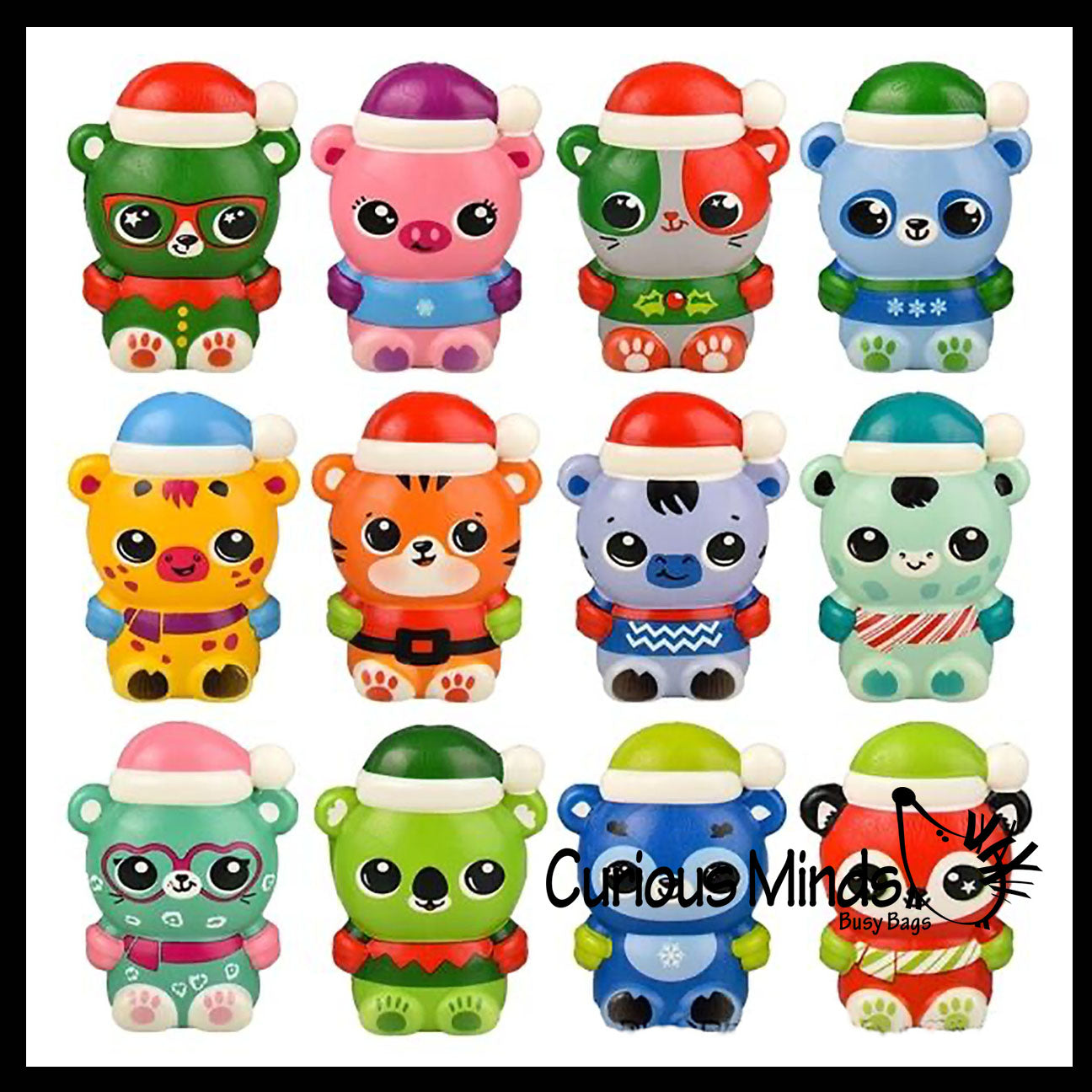 These Christmas themed toys are made from the cool memory foam slow rise squishy material. It is super soft and squishes easily then slowly comes back to its shape. The squishy toys make a perfect holiday or winter party favor or prize and also a perfect stocking stuffer. Since it is a squeezy toy it makes a fun stress ball and helps build hand strength! Comes in 12 different animal styles all dressed up in winter clothing. Animals are 1.75" tall, by 1.5" wide, by .75" deep.
