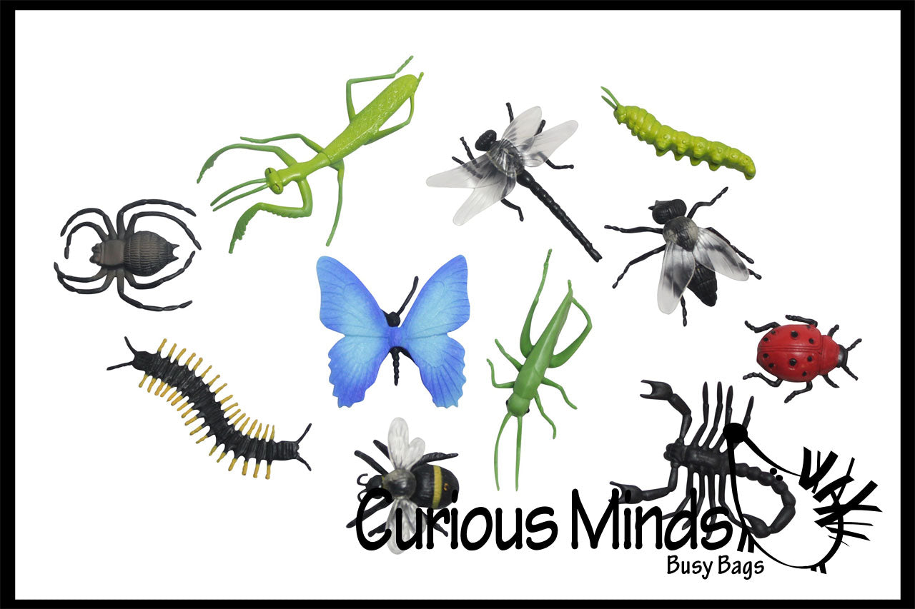 This bugs and insects animal toy figurine set comes with 11 miniature toy animals. Animals replicas measure 2"-3.5" long and are made of plastic. This set is perfect for pretend play or Montessori continent boxes.