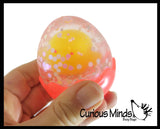 This soothing egg-shaped sensory ball is so cool. The ball is filled with a a clear liquid and glitter inside its flexible skin. Each egg has a colorful animal, either a bunny or chick, inside the egg. Squeeze it to make the animals move inside the egg. The eggs come in 4 colors with different color animals inside. The egg is 2.5" x 2".