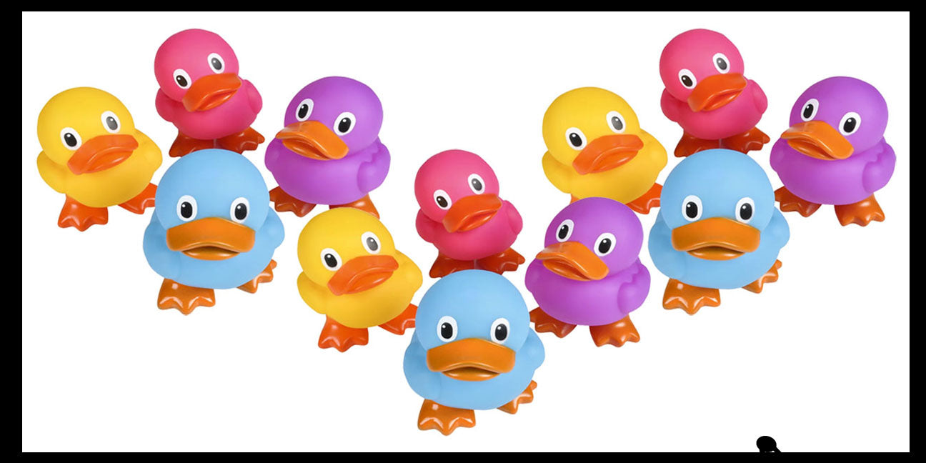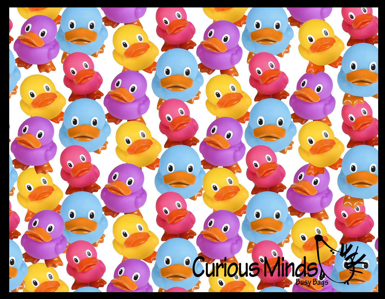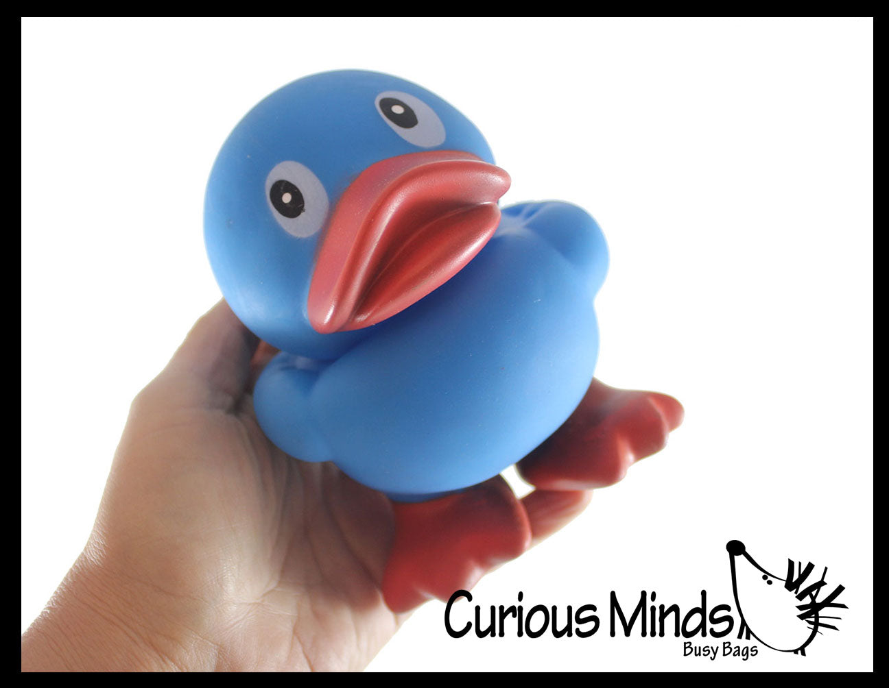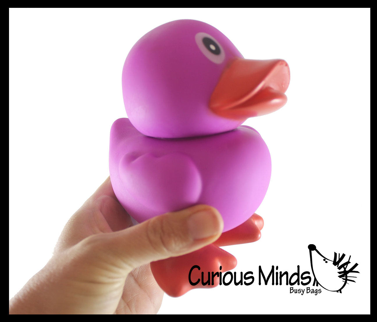 These colorful rubber ducks are a great cost-effective reward or prize for classrooms, offices, carnivals and goody bags. Each duck is 5" tall x 3.5" x 4", and comes in 4 bright colors. These ducks are unique since they actually have legs that they stand on. Super cute decoration.