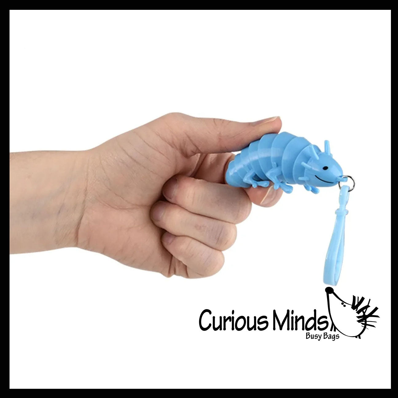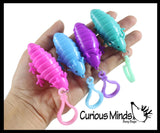 This axolotl is a super cool fidget! The walking fish is a smaller size measuring in at 2.75" long and 1" wide. This animal has a clip so you can take it with you! The critter is made up of several hard plastic bowls that are connected. This gives the animal a jointed and robotic movement. You can twist and spin the axolotl in your hand. The hard plastic makes a nice sooting sound as the colored cups rub together and move. It is quite mesmerizing to feel. Great sensory toy. These tiny axolotls are the perfect size for your key ring or a backpack charm. Comes in 4 colors.