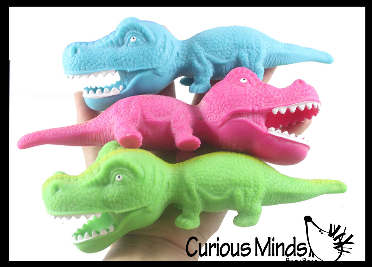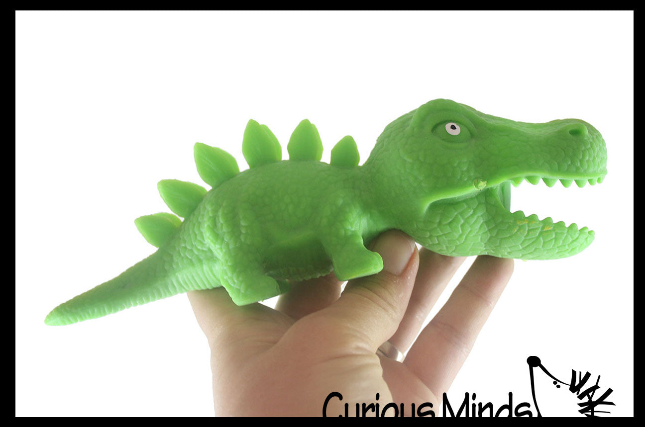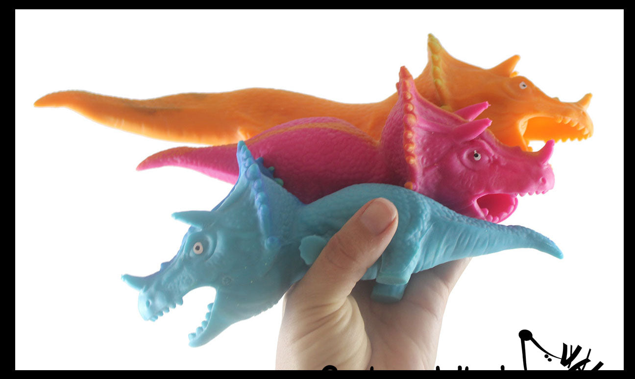 This dinosaur stress toy is so fun to manipulate. This dino is filled with a fine granular filling surrounded by a soft and stretchy silicone shell. This makes the prehistoric reptile irresistible since you can squeeze, poke, pull, stretch and bend it! Smash it flat and roll it back to its original shape. 8.5" x 3" x 2". Comes in 4 different dinosaur breeds and 4 bright colors.