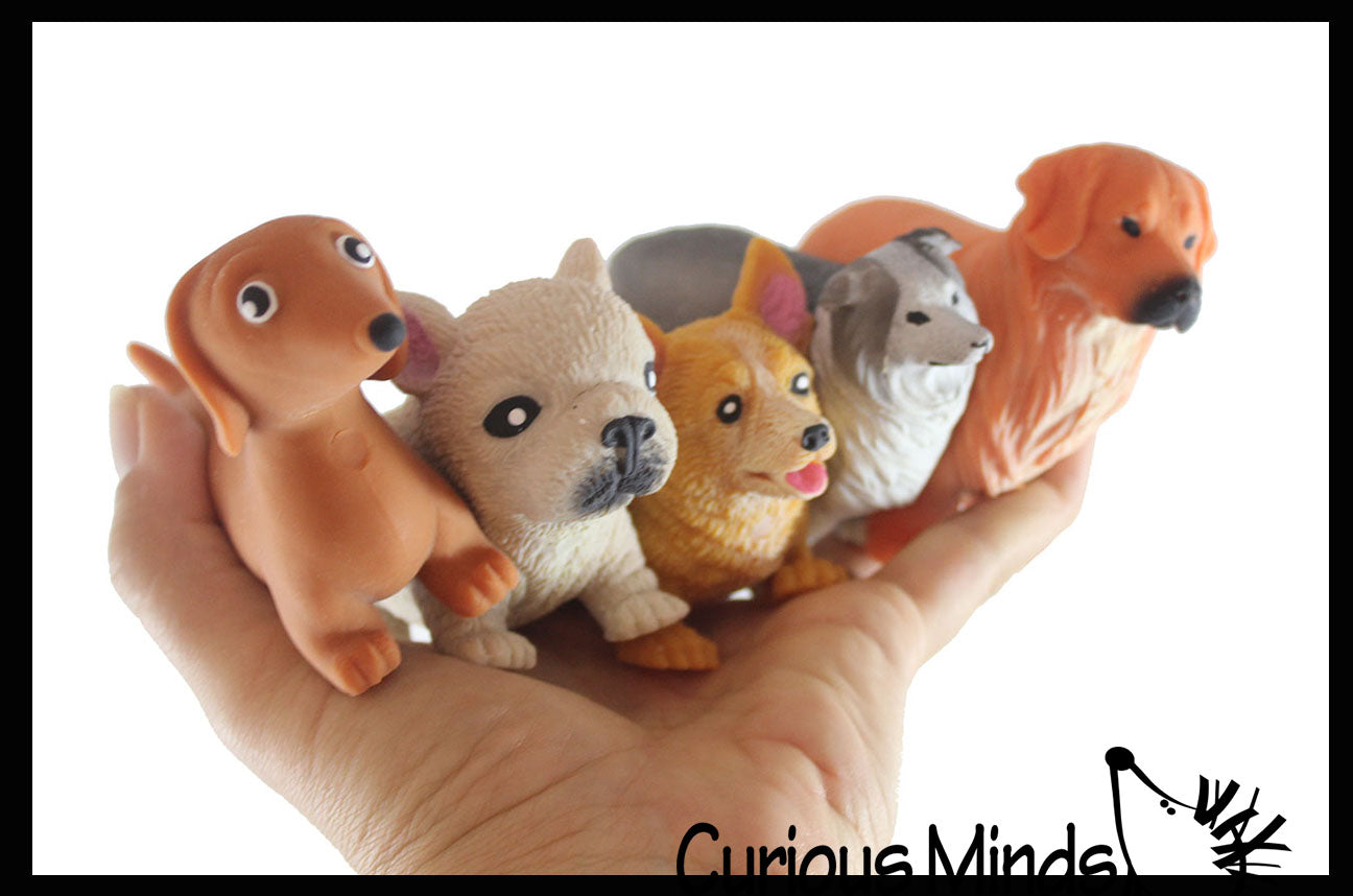 SET OF 5 DIFFERENT DOG BREEDS - Includes one of each of the following breeds: corgie, golden retriever, collie, bulldog, and dachshund. These cute doggy stress toys are so fun to manipulate. These dogs are filled with a fine granular sand-like filling surrounded by a soft and stretchy silicone shell. The dog is super soft and slightly weighted and has a sand filling inside that add to the sensory experience. The little balls make a quiet crunch like sound when they are squeezed. This makes the puppy irresistible since you can squeeze, poke, pull, stretch and bend it! Smash it flat and bring it back to its original shape. Each pup can be squeezed and stretched!