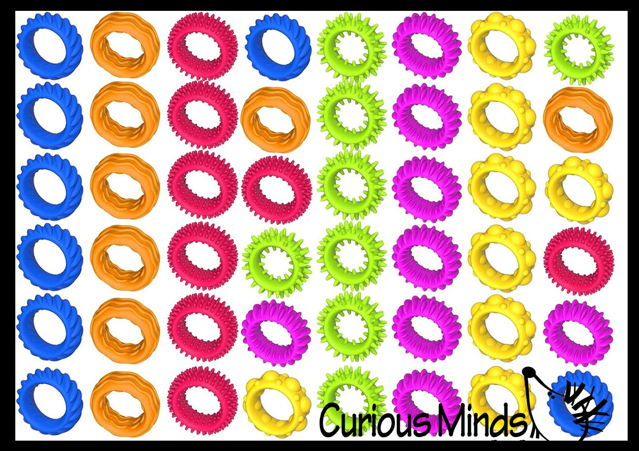 These bright and colorful rings are fun fidget toys that you can wear. Each ring is 7/8", and has a soft, textured silicone skin. These are soft and squishy so you can pinch them and rub the texture. These are a nice quiet and discrete fidget that is easy to take with you or use in the classroom or office.