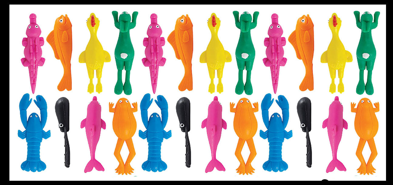 These stretchy animals are 3.25" long (unstretched) and are perfect prizes or party favors! These soft toys are made to be stretched far because they are also a sling shot! Stick your finger in the pocket under the animals head, pull back, and let it fly! Comes in 8 animal themes including: Fish, chicken, alligator, bunny, lobster, squid, dolphin, and frog. Each style comes in random colors. Packs will be a random assortment and may not have equal numbers of animals.