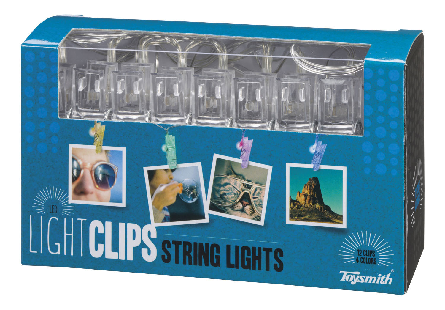 String light of 12 clips in four assorted light colors. String is 56in long plus battery pack. Requires three AA batteries not included. 6.25in x 2in x 3.625in. A cool way to hang your favorite photos.