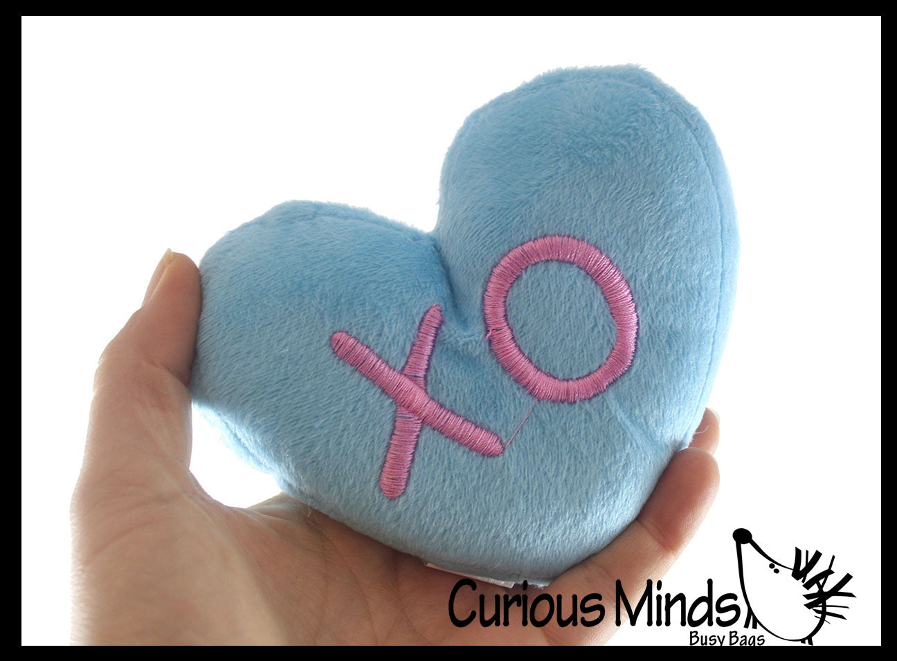 These adorable conversation heart candy Valentines day themed toys. These hearts are soft plush toys with a different saying on them making them ideal for party favors or prize boxes. Use them in place of Valentine's Day cards during a classroom exchange party. Ages 3+. Each plush is 5.5" x 4.5". Plush comes in 4 colors: Purple (YOU ROCK), Pink (BFF), Yellow (CUTIE PIE), Blue (XO).
